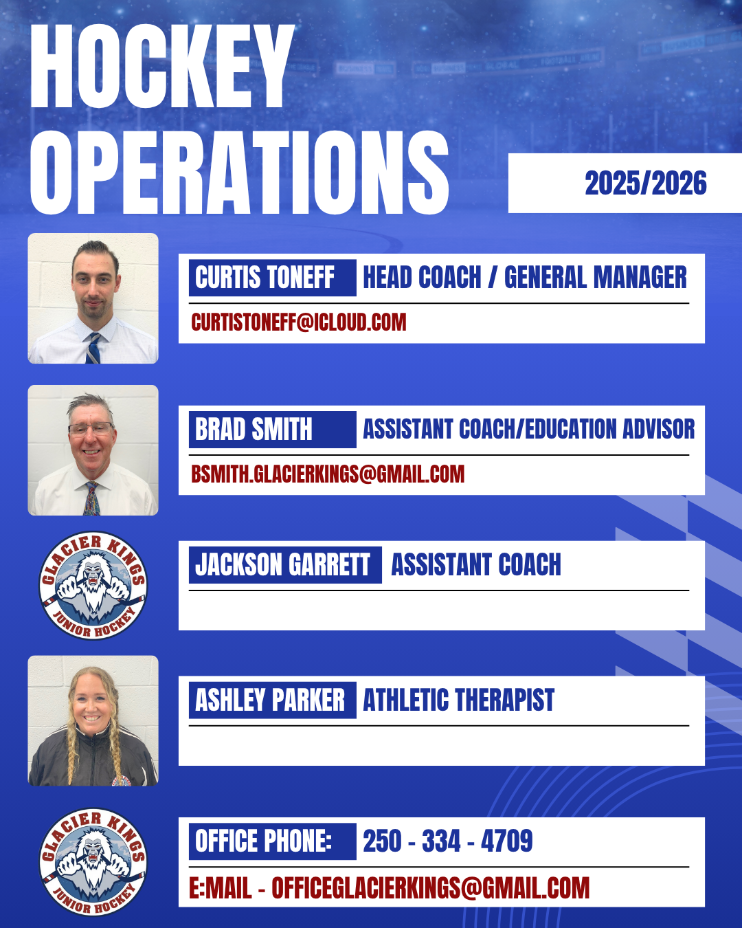 Office Phone Number: 250-334-4709 E-mail: officeglacierkings@gmail.com